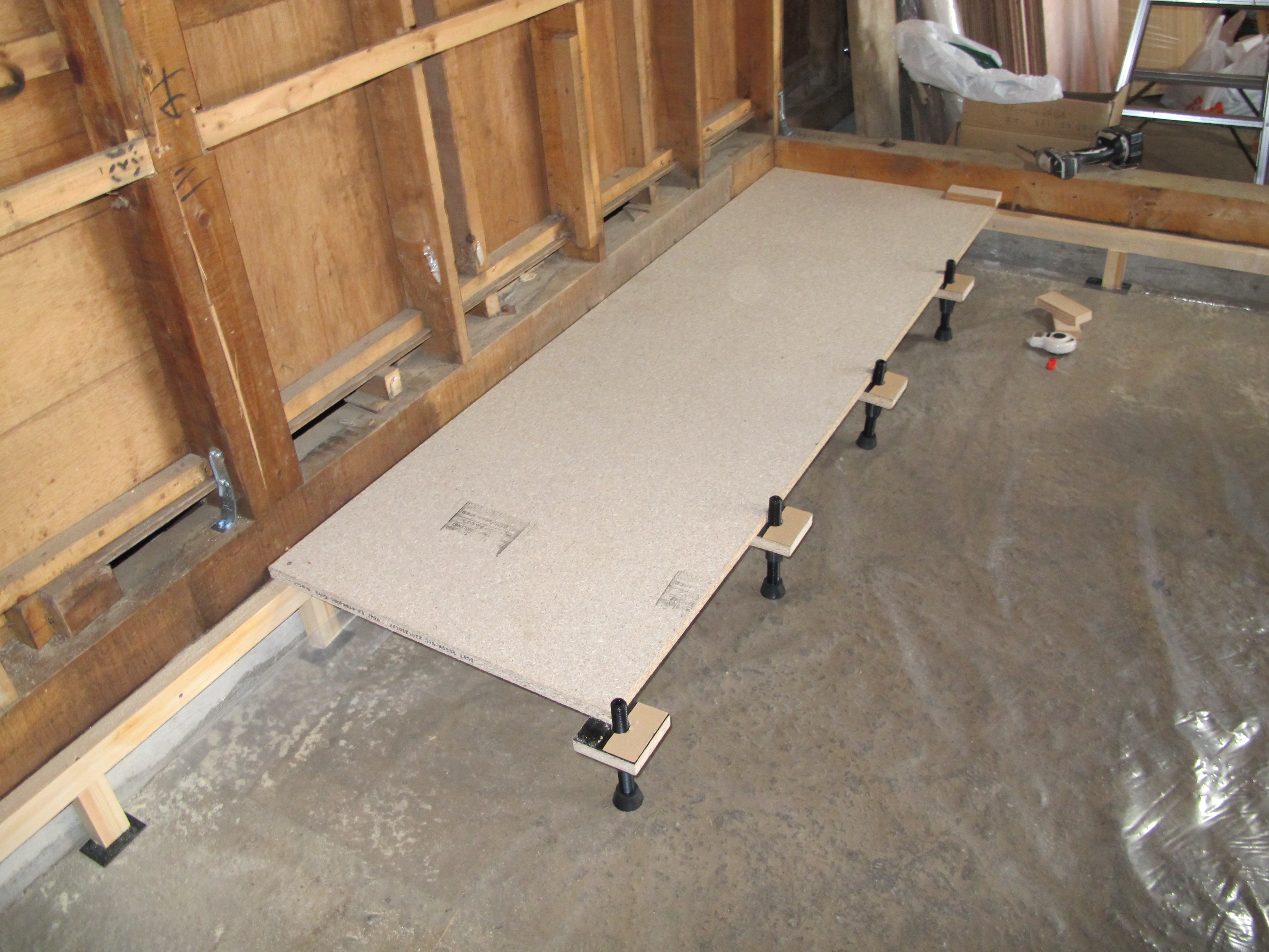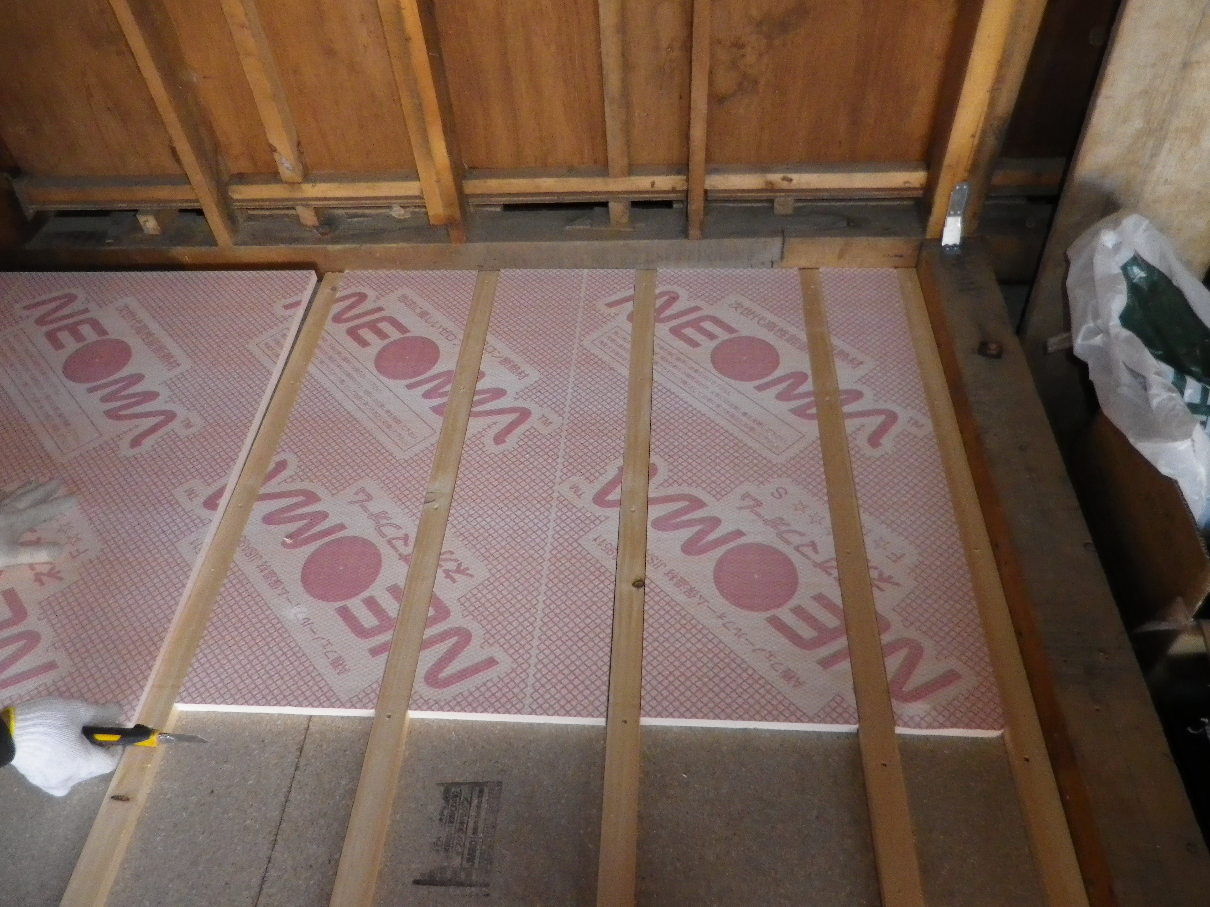 2階部分の鉄骨梁の高さまでしか天井高を確保することができなかったので、床の下地をマンションなどで使用されている、置き床を使用して最低限の高さで納め、床下にはネオマフォームを敷き詰め断熱しました。