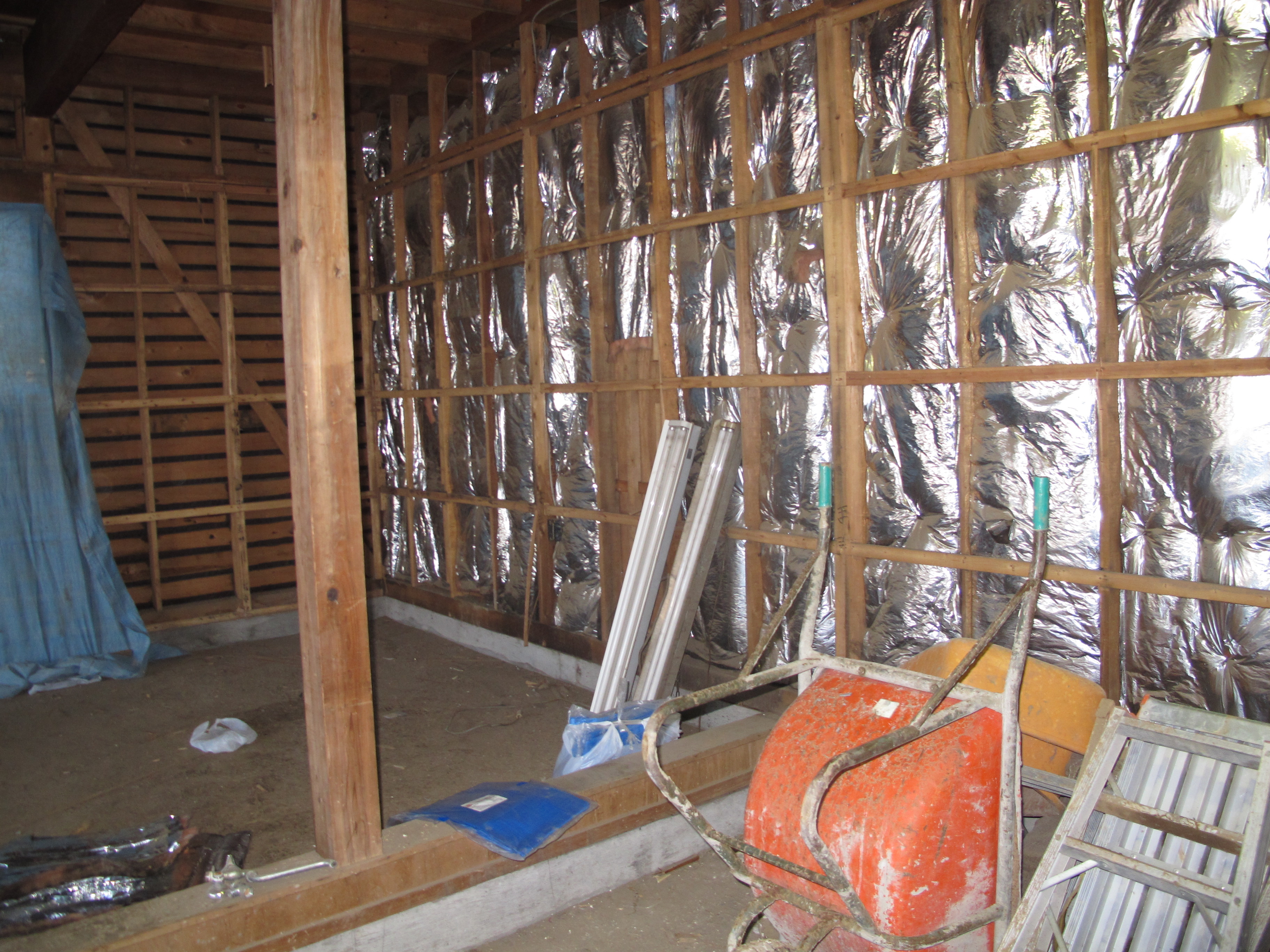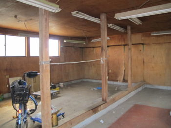 | ご提案内容 | いままで倉庫として使用していたので、床のコンクリート土間と2階まで高さに制限があったため、床下のスペースを確保することができませんでした。 そこでマンションで使用される置き床を下地にして、その上に断熱材を入れて高さと断熱を確保する方法でご提案しました。既存の柱を使用して間仕切り位置も考えて、16坪のスペースにキッチン・浴室・トイレ・洗面所の水まわりとリビング・寝室を作るプランニングをしました。 |