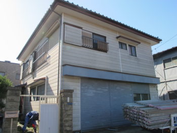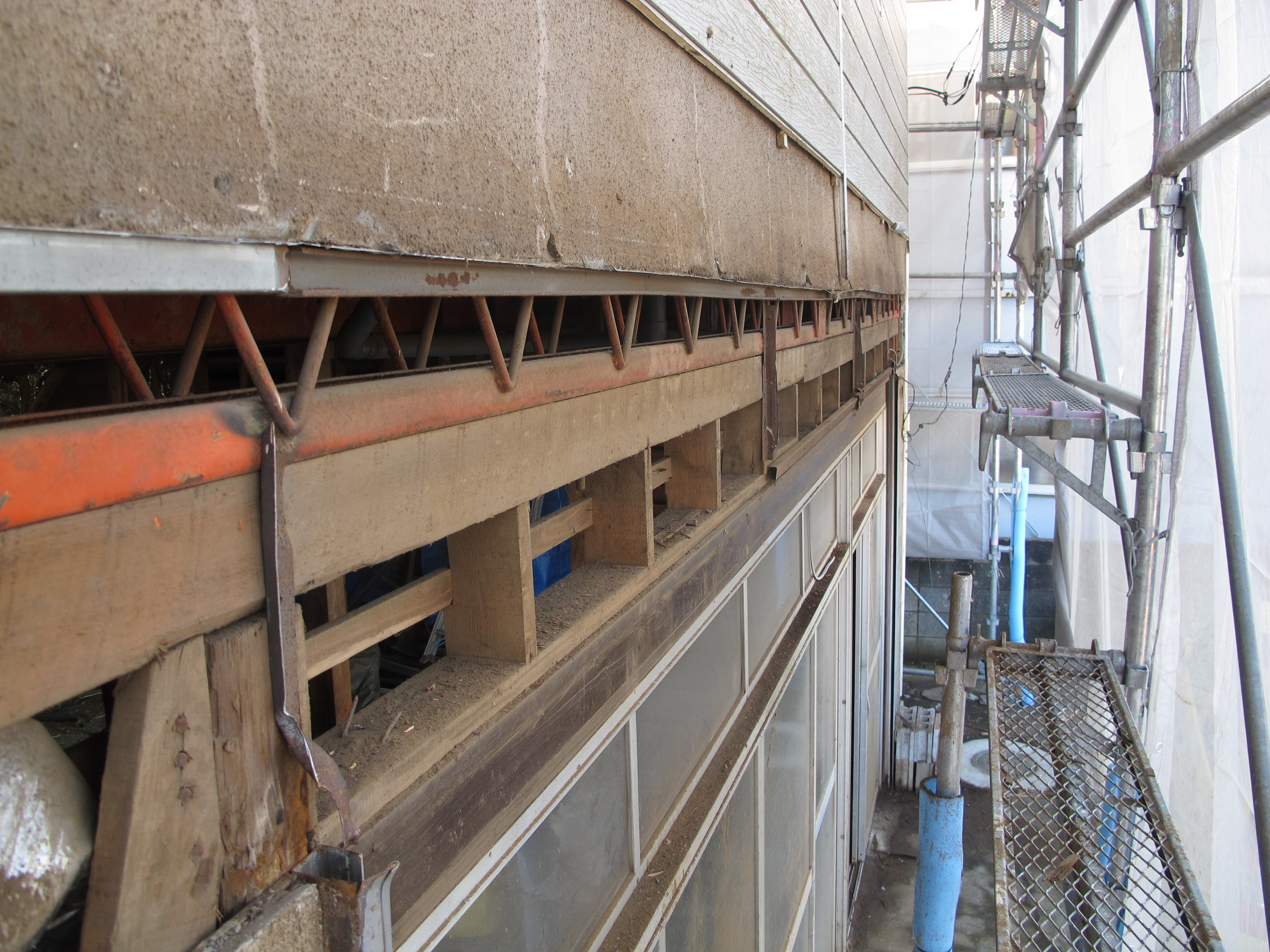 こちらが施工前の様子。1階部分は道路前面に大きないシャッターがありましたので、シャッターを撤去して外壁を作り変えていきます。