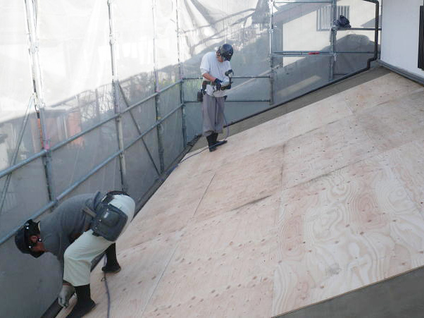 屋根下地合板の重ね貼り。