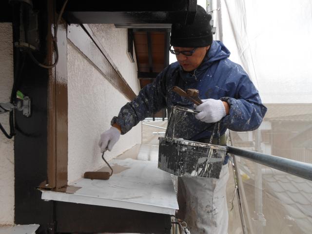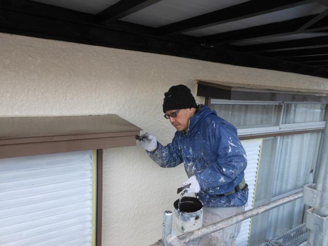 霧除け屋根鉄部の上塗り。