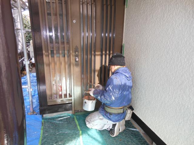 木製玄関ドアの塗装。