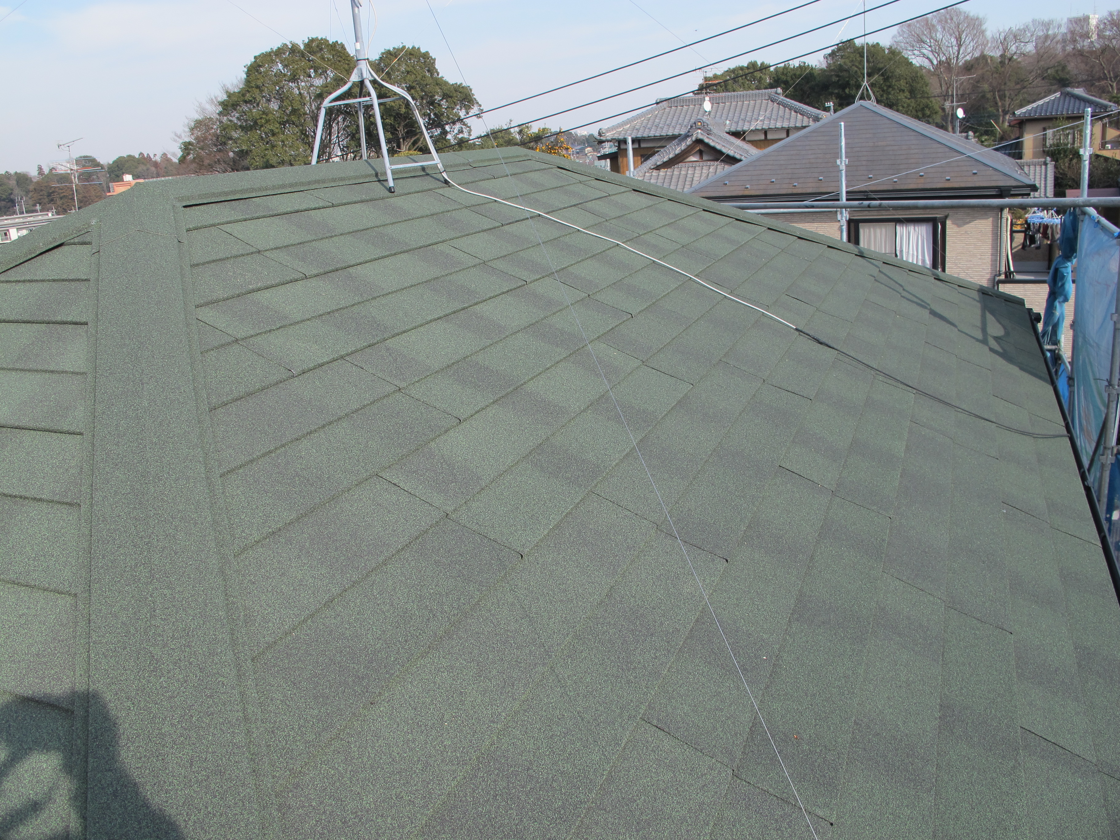 | ご提案内容 | 既存屋根のコロニアルは、色あせやコケなどの経年劣化は目立ちましたが、雨漏りや下地の状態に問題がなかったため既存屋根材の上から被せるカバー工法で施工しました。使用した屋根材は、ディーズルーフィングのディプロマット。ディプマットは石粒付き屋根材の中でも一般的なガルバリウム鋼板屋根材と価格帯が変わらず、塗り替えなども必要ありませんのでおすすめの屋根材です。 新築時のベランダ床FRP防水のトップコートの剥がれが多数見られ、上からトップコート塗装することが出来なかったため、シート防水を新たに施工しました。 |
