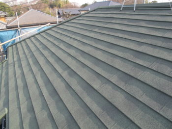 今回は既存屋根材の上から重ねてカバー工法で、使用した屋根材は超軽量で表面には天然石が吹付けしてあるディーズルーフィングのディプロマットです。