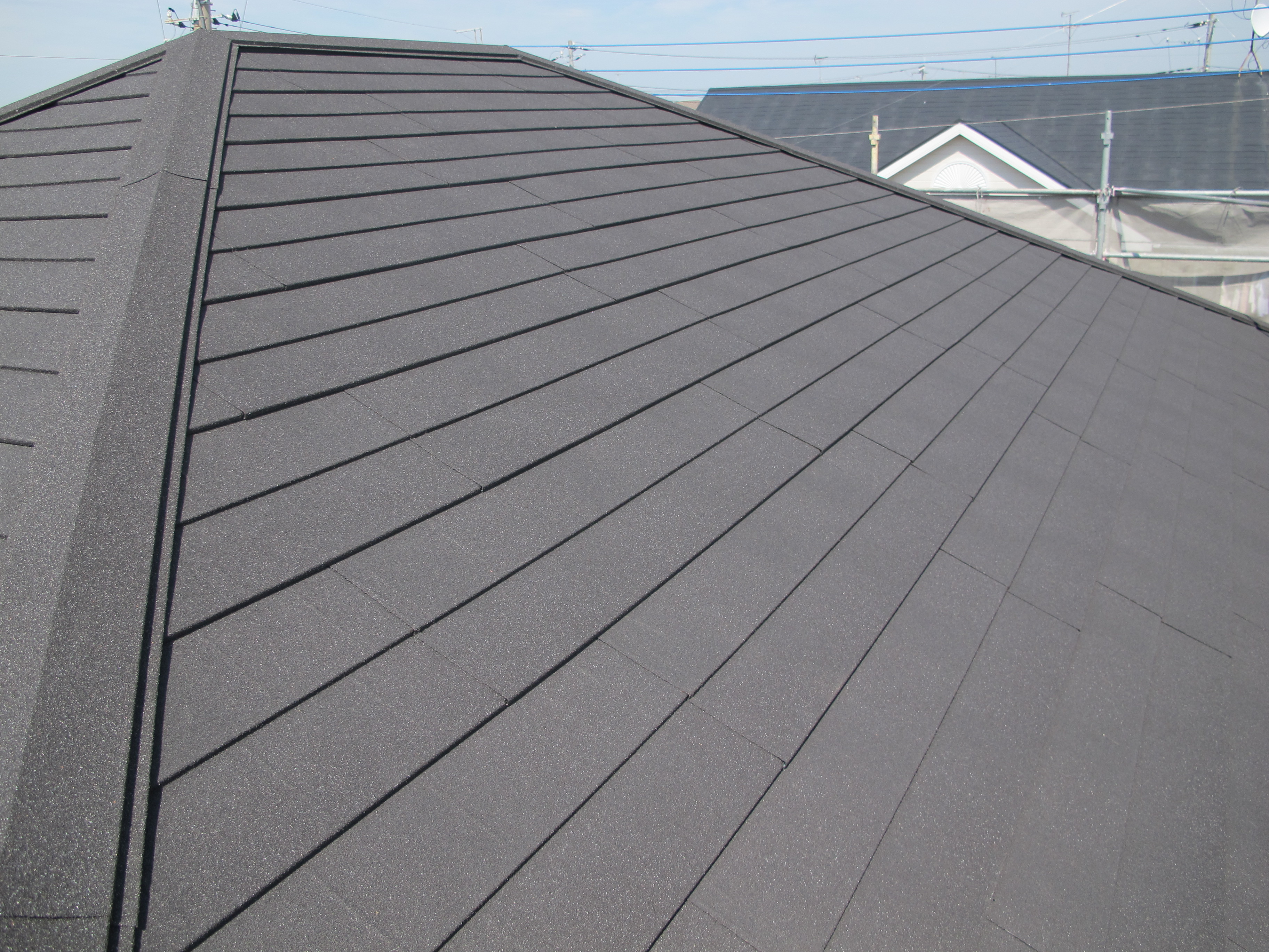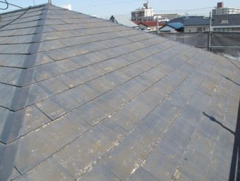 | ご提案内容 | 既存屋根のコロニアルは、色あせやコケなどの経年劣化は目立ちましたが、雨漏りや下地の状態に問題がなかったため既存屋根材の上から被せるカバー工法で施工しました。使用した屋根材はディーズルーフィングのディプロマット。このディプロマットは金属系屋根材の中でも廉価な商品でありながら、表面に天然石を吹き付けしてあるので、塗り替えなどの定期的なメンテナンスが必要ありません。 |