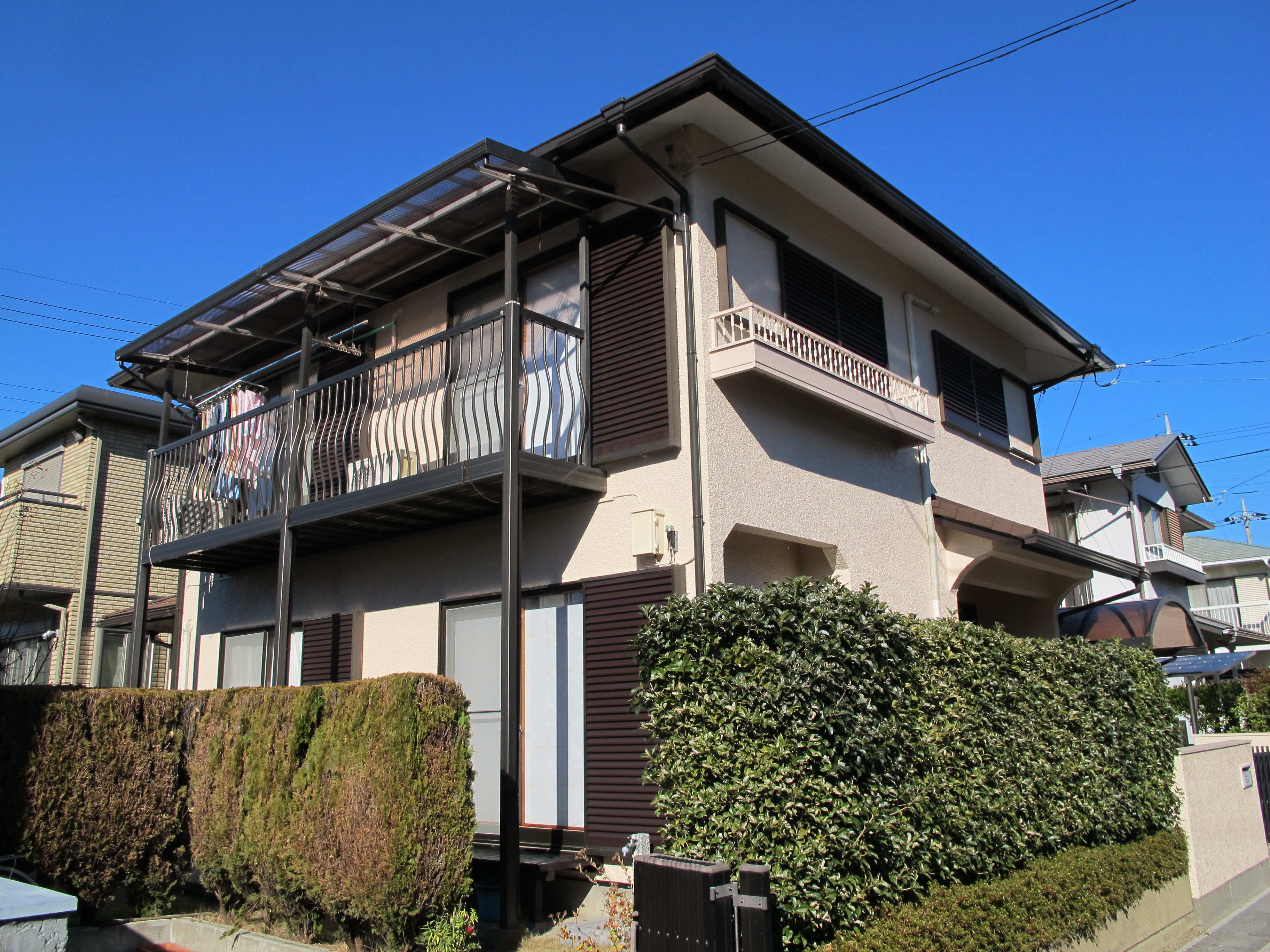 外壁は水性アクリルシリコン樹脂塗料の関西ペイント・アクアセラシリコンで塗装しました。明るめなベージュ系の外壁と屋根のブラウン系の色合いで仕上げました。
