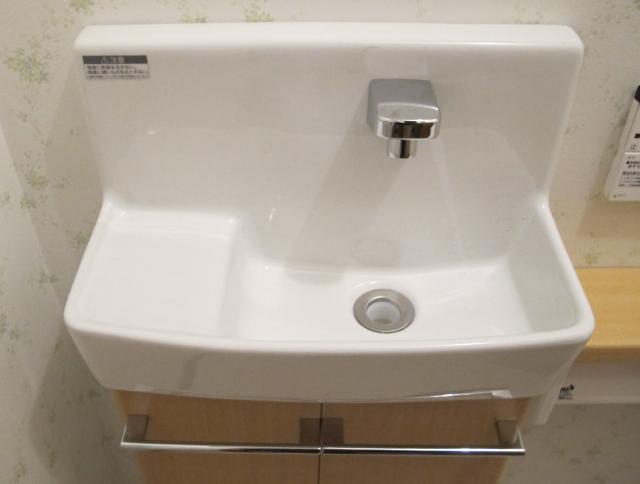 手洗いキャビネットは水のムダがない自動水栓を採用しました。手をかざすと自動で吐水・止水し水のムダがなくラクに節水出来ます。