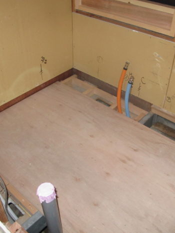 既存のユニットバスを解体。支持脚が乗るところには、大引きを取り付けして補強します。